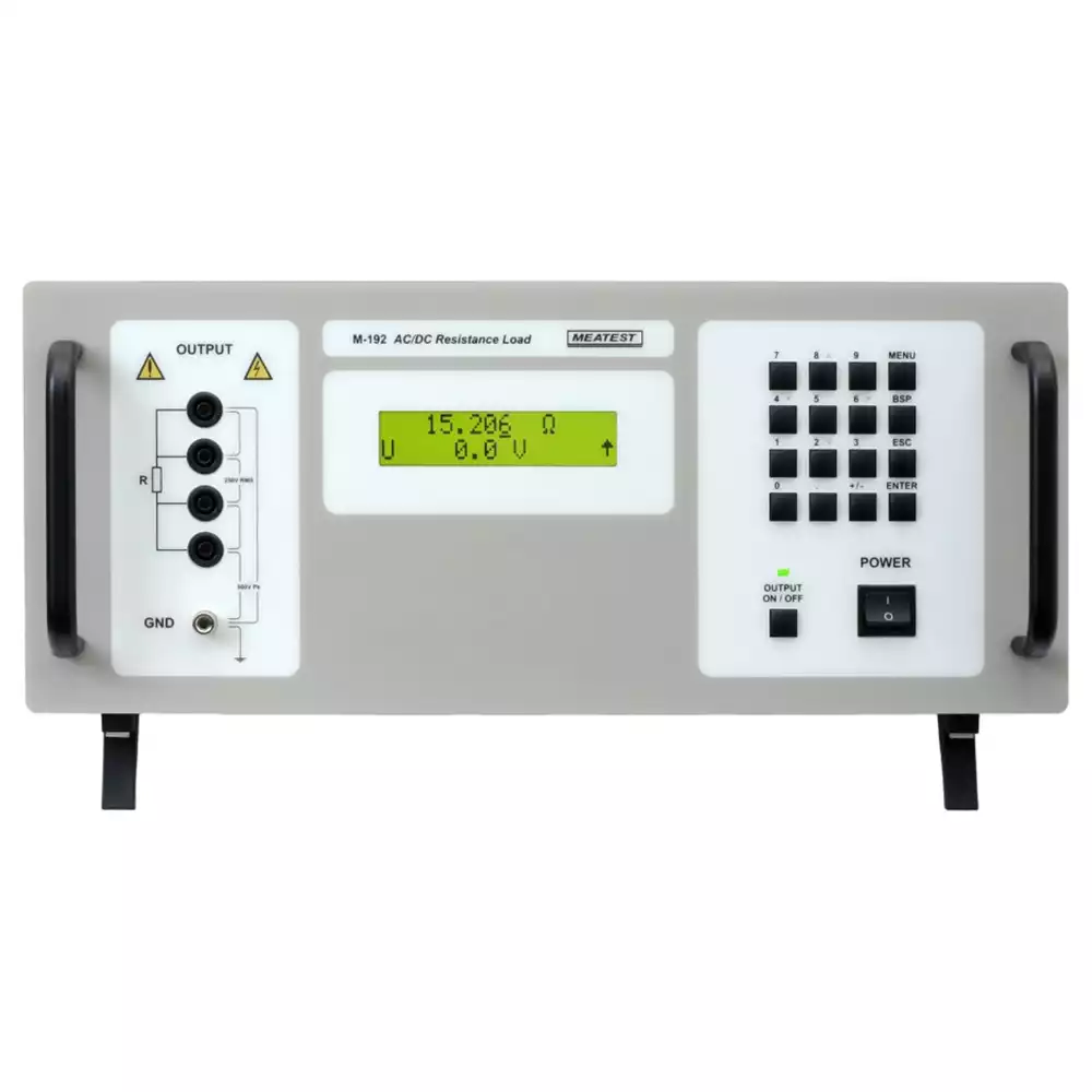 Прибор M-192 представляет собой точную мощную нагрузку с регулируемым сопротивлением от 15,000 Ом до 300 кОм. Нагрузку можно использовать при сопротивлении до 3000 Ом и напряжении до 250 Вэфф Диапазон частот — от постоянного тока до 10 кГц. Нагрузка устроена как набор мощных резистивных сегментов, переключаемых посредством реле. Нагрузка хорошо подходит для применения в автоматических испытательных системах. В стандартной комплектации прибор оборудован интерфейсом RS-232, а в качестве опции может комплектоваться интерфейсом GPIB (IEEE488).