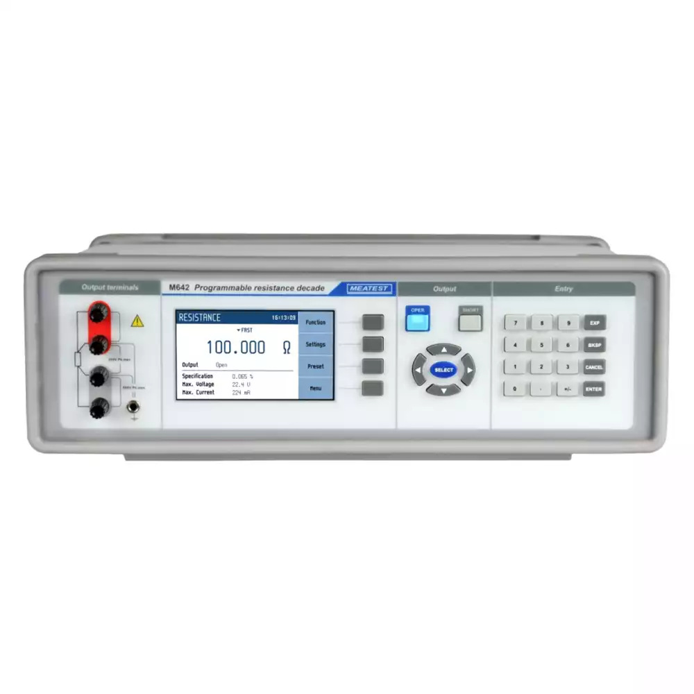 MEATEST M642 — это электронный магазин сопротивлений с диапазоном от 100 мОм до 20 МОм, предназначенный для точной настройки и имитации резистивных нагрузок. Прибор идеально подходит для калибровочных лабораторий и испытательных стендов, обеспечивая высокую стабильность и удобство в эксплуатации.