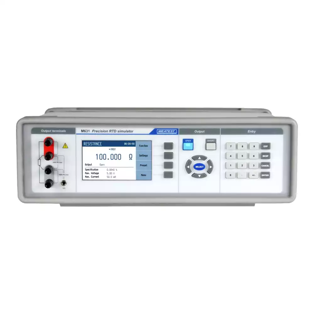 M631 — это программируемый эмитатор термометров сопротивления с параметрами, специально разработанными для имитации датчиков сопротивления (RTD) и тестирования блоков оценки RTD, таких как регуляторы температуры, преобразователи и т. д. Основная функция устройства — сопротивление, поэтому вы также можете легко калибровать омметры и другие измерители, основанные на сопротивлении. M631 изготовлен с использованием одних из самых стабильных (и дорогих) фольговых резисторов, что обеспечивает температурный коэффициент 1 ppm/°C, точность 0,01°C и разрешение 0,001°C. Плавающие выходные клеммы декад серии M6xx позволяют выполнять и измерения переменного тока (см. паспорт для типовых частотных характеристик).