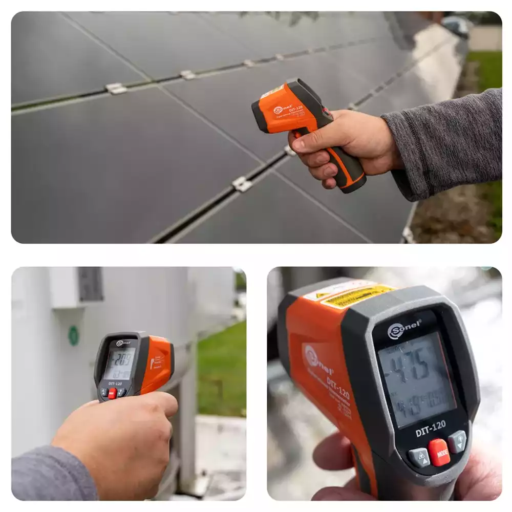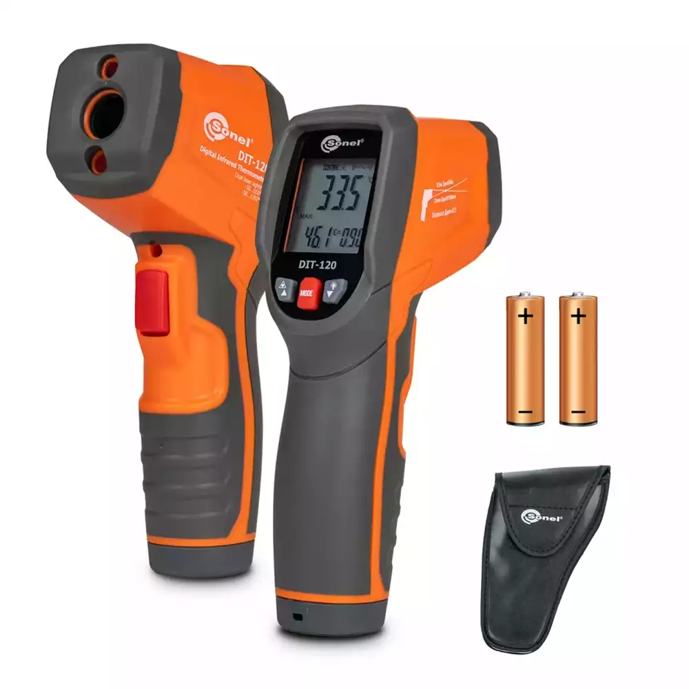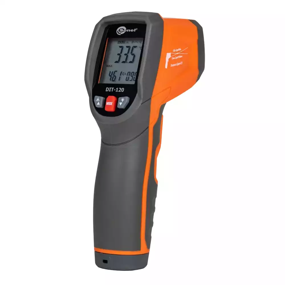 Sonel DIT-120 — это пирометр для профессионалов. Прочный корпус, эргономичная рукоятка, кнопки, доступные для управления одним пальцем — всё это повышает комфорт пользователя. Технические параметры говорят сами за себя. Продвинутый лазерный указатель точно и однозначно укажет область выполняемого измерения.