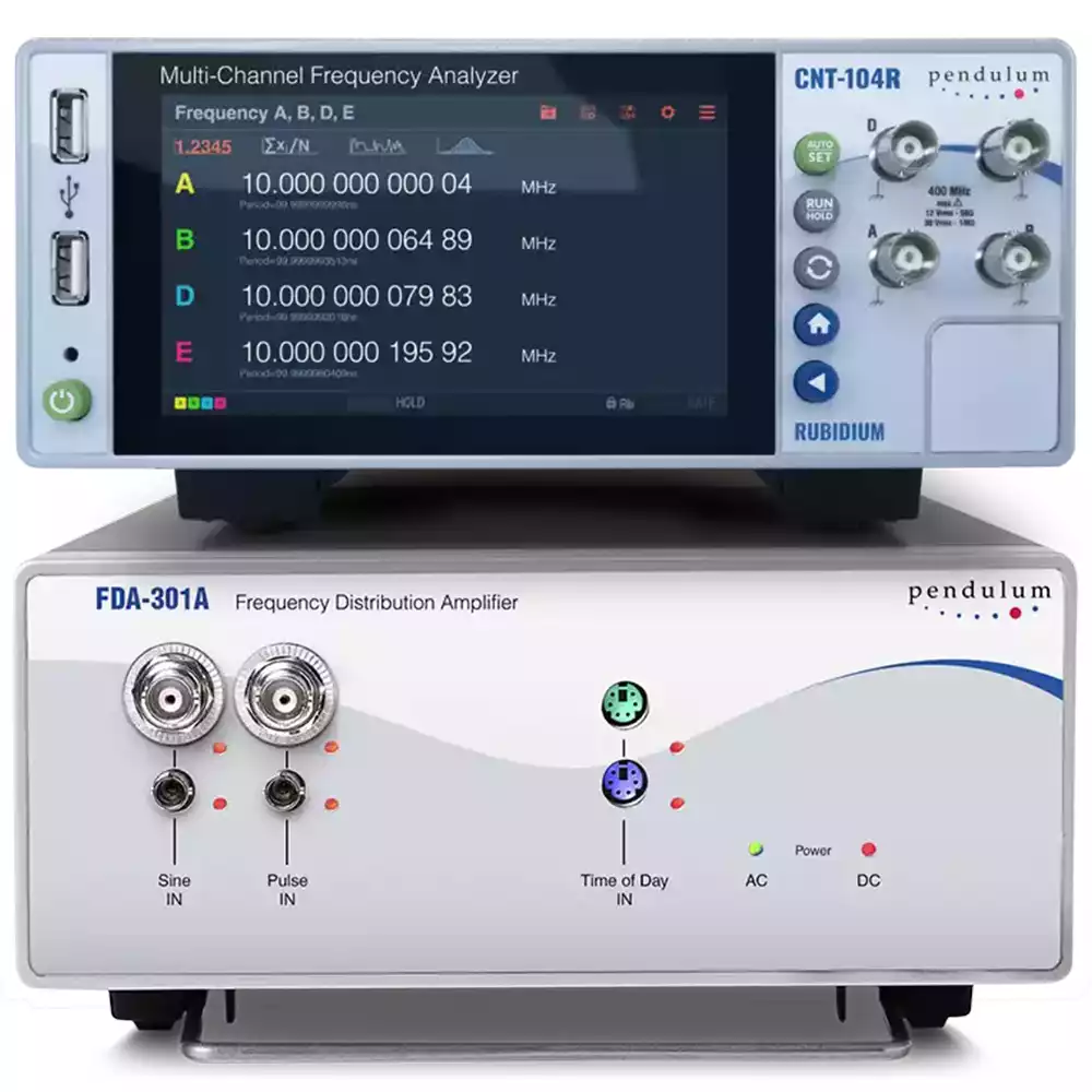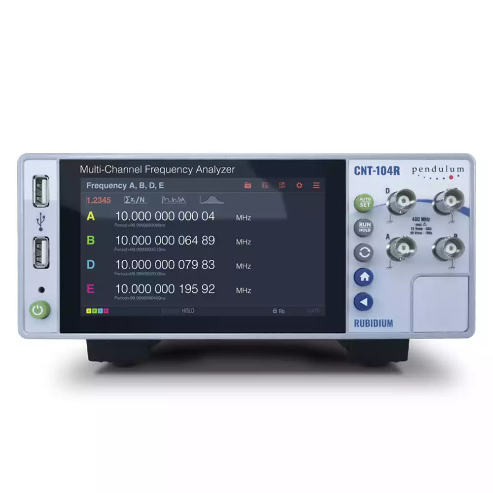 Pendulum CNT-104R — это новое решение для сверхточной многоканальной калибровки и анализа частоты и временных интервалов в настольном исполнении. Это комбинированный прибор «всё-в-одном»: калибратор частоты и временных интервалов, объединяющий сверхстабильный рубидиевый частотный эталон 10 МГц и 4-канальный анализатор частоты. Прибор позволяет одновременно калибровать до 4 осцилляторов/генераторов на 4 входных каналах.